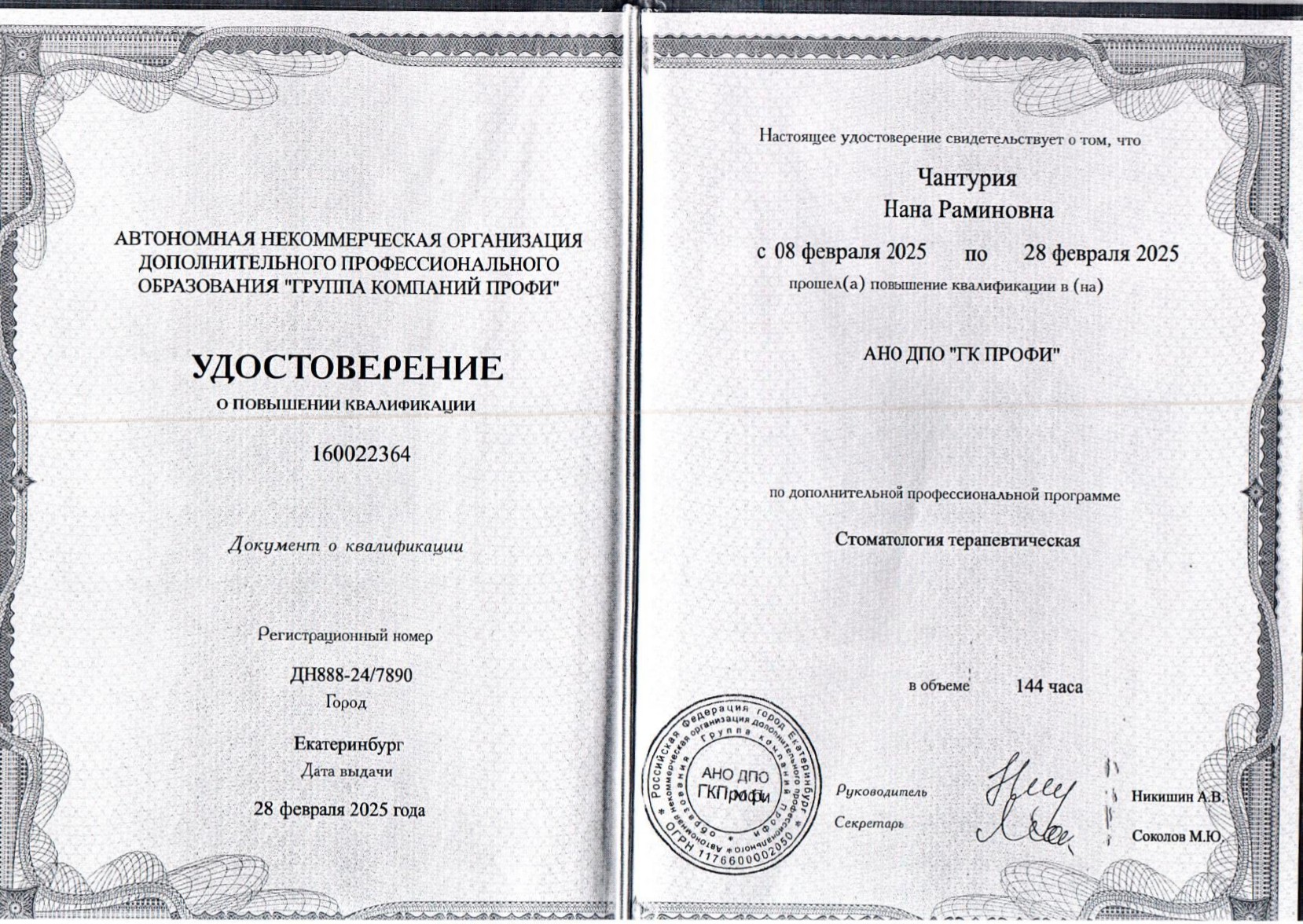 - 2025г. — Профессиональная переподготовка ВНО ДПО «ГК ПРОФИ». Стоматология терапевтическая