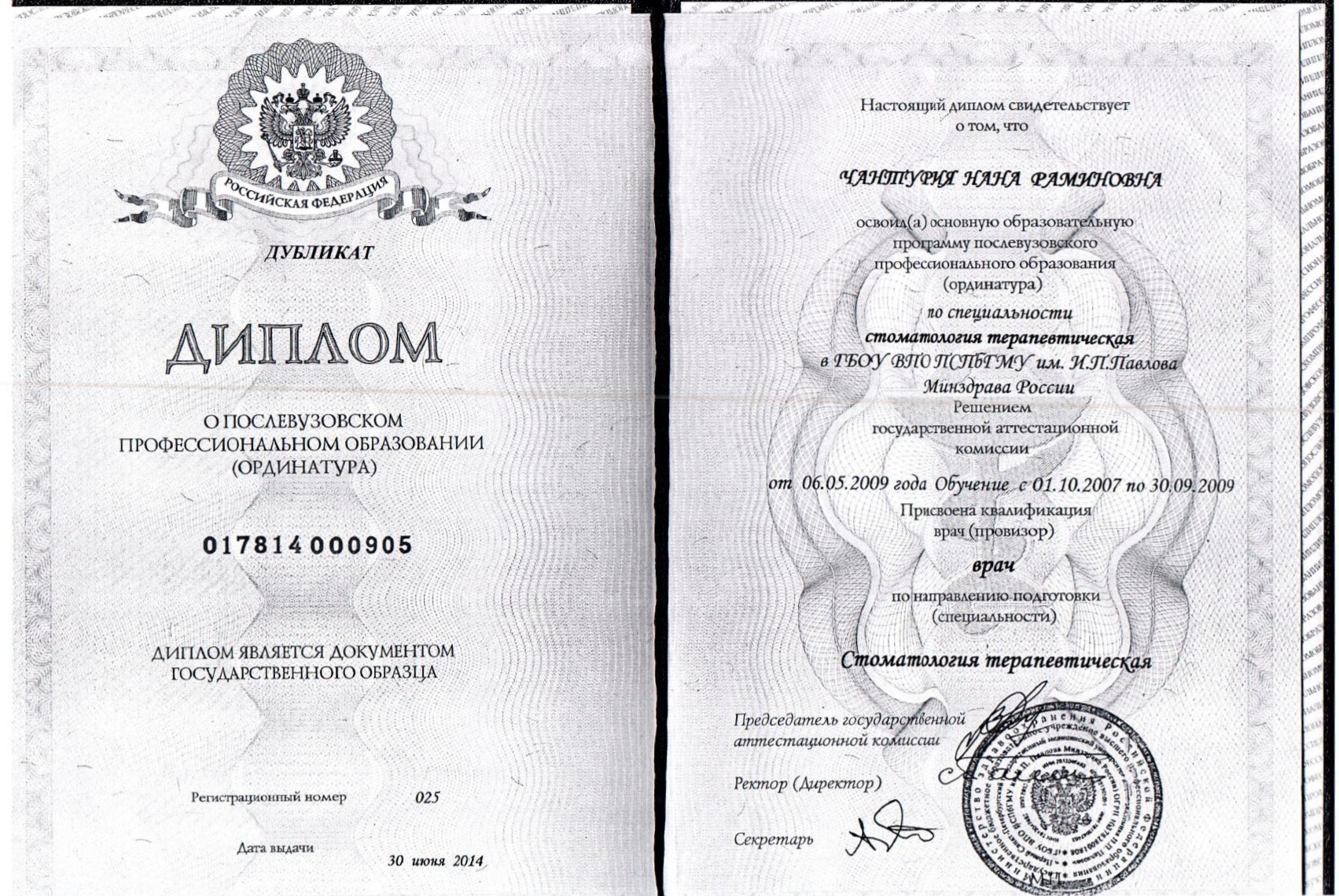 - 2014г. — Ординатура. ГБОУ ВПО ПСПБГМУ им. И.П.Павлова. Стоматология терапевтическая